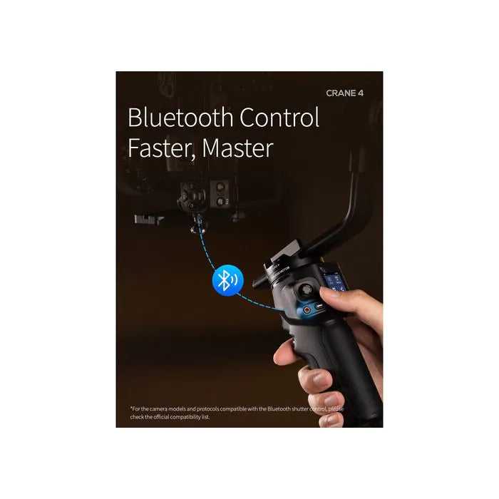 Dual-Layer Quick Release, Lens SupportMount your camera of choice on the camera quick release plate or upper quick release plate for efficient integration and balancing with the dual-layer plates on the CRANE 4. The lower quick release plate slides in the landscape orientation baseplate and offers a mounting point for the included lens support when using heftier full-frame lenses. The upper quick release slides easily into the portrait orientation baseplate.Bluetooth 5.0 Shutter ControlWhile the included camera control cables offer the option for wired shutter control, avoid complicated cable runs by using the embedded Bluetooth 5.0 shutter control. Wirelessly control your compatible camera's shutter and toggle recording via the onboard controls and touchscreen. For a full list of Bluetooth-compatible cameras, please see the most current compatibility information on the Zhiyun website page or see the camera compatibility list in PDF format.Powerful, Bright Fill Light